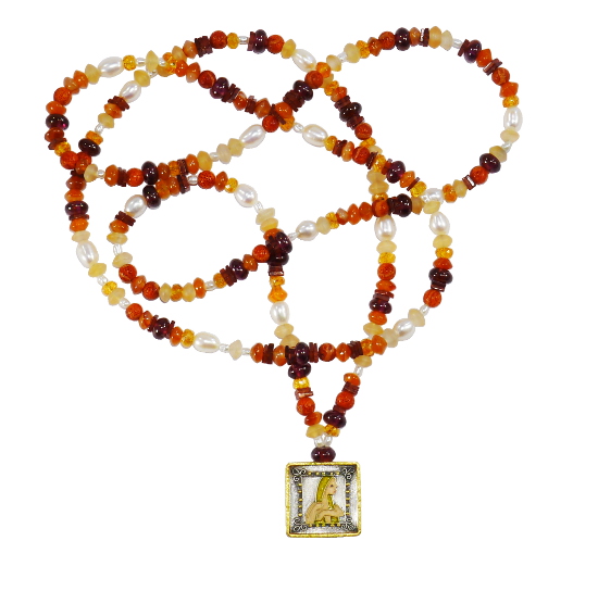 Kette aus Granat, Mandaringranat, Carneol, Koralle und Perlen. Anhänger aus Silber, 900/- Gold und Brandlack